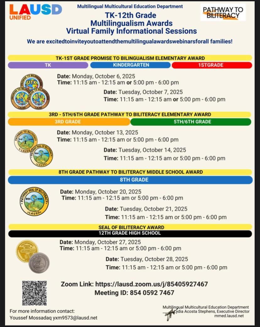During the week of October 6 and 13, the Multilingual Multicultural Education Department (MMED) is offering a series of informational webinars to help families learn more about the awards. Please see the attached flyer for information to join.